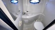 Below deck: Adjustable lighting, deep pile carpeting throughout, designer fabrics, and a dinette that converts to a v-berth sleeping area.