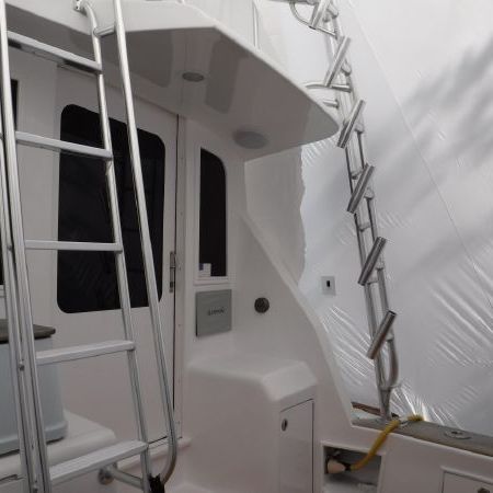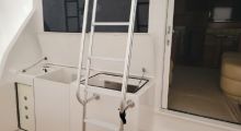 The helm of this 55ss is equally as impressive as the rest of the boat. Besides the FUSION bluetooth audio system with 2000 watts of power, subwoofers, and plenty of speakers both on the bridge and in the cockpit, there are no less than 6 Garmin 10" and 12" MFDs to allow the captain keep tabs on everything. FLIR, 72mi 6' open array radar, Wesmar 800 scanning sonar, cameras, autopilot, VHF, Humphree automatic tabs, and more. Custom swivel helm seats as well as crew benches keep everyone comfortable while enjoying the view. A complete custom enclosure keeps the elements under control, and Aqua-Dex which matches the cockpit allows sure footing. The custom Oceanview Welding tower with upper station controls also features Lee outriggers and center rigger.