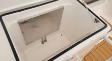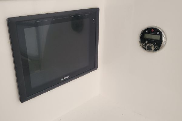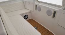 The cockpit is designed with fishability and comfort in mind. A custom fighting chair and rocket launcher post take center stage and give options to suit the needs of the fish being sought. There is ample storage on both sides of the bulkhead, along with a prep station with sink, engine room access, and bait freezer. A 12" Garmin MFD flush-mounted in the starboard bulkhead wall allows the cockpit crew to view the scene below the surface, and a massive in-floor freezer will keep even the largest of catches fresh. Rod and gear storage abounds, and Aqua Dex offers sure-footed traction.