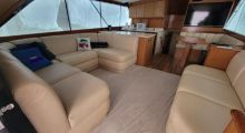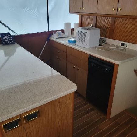 Step inside the luxurious and spacious salon and it'll be hard to remember this isn't a brand new boat. Both of the custom leather sofas, straight to starboard and U-shaped to port, offer plenty of comfort and bonus underneath storage. The matching L-shaped dinette accommodates the crew for snacks and meals, while a massive Sony flat screen TV with Bose audio and DVD keeps everyone entertained. Down the steps to starboard is a stateroom featuring twin berths and its own head & shower. To port is a stateroom with a double berth, flatscreen TV with DVD, and its own head/shower. Hidden in a hallway compartment is a combination clothes washer and dryer. Moving forward you'll find the large master stateroom with centered queen berth, flatscreen Tv with DVD, more than enough cedar-lined cabinetry, and yet another full head and shower. A total of 5 AC units keep the climate under control.