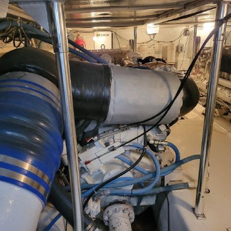 Power comes from MAN V12 1300hp turbodiesels which currently show ~820hrs. HD ZF gears turn 3" shafts with 4 blade props, and a spare set of 5-blades are included. Glendinning controls and synchronizer. Phasor 20kw marine genset with new Isuzu marine engine ~20hrs.