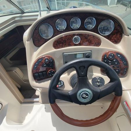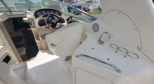 Sea Ray hit all the right buttons with the 280 Sundancer: attractive styling, top-shelf amenities, and a well-appointed interior with comfortable accommodations for six. Beginning with her spacious single-level cockpit with wet bar, portside lounger, and transom door, the stern bench seat folds out of the way when not needed and the rear-facing bench seat converts to a sun lounge.