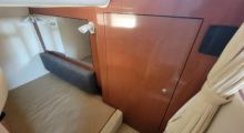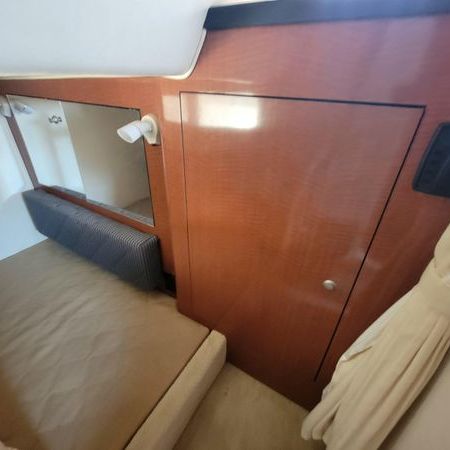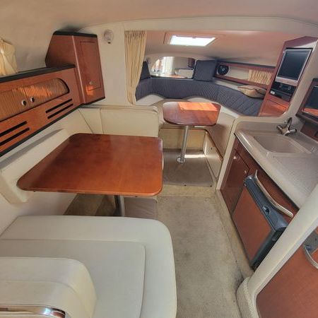 A centerline companionway leads to this 280’s cherry-trimmed interior with U-shaped dinette to port, full-service galley opposite, convertible V-berth forward (with removable table), and a compact head/shower with Vacuflush toilet to starboard. Privacy curtains separate both sleeping areas from the salon.