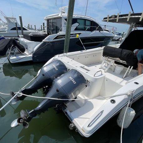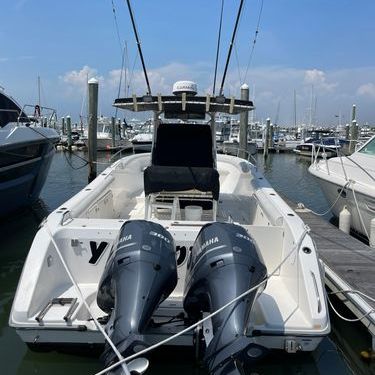 The Century 3200 is designed to provide Excellent gunnel heights forward for the offshore Fisherman with an expansive cockpit and the ability to sleep one in the Helm Console. Mulitple Large in-deck fish boxes, Large Beam, bait prep station, 3x Rocket Launchers and plenty of rod holders makes this a pure fishing machine from the bay to the Canyons. Don't mistake this fishing beast as one dimensional. Excellent seating and a very comfortable Helm Console makes her a very family friendly Center Console. Fishing, Cruises and sandbars this 3200 covers it all. Powered with newer very reliable 2020 Yamaha Digital 300's with only 153 hours makes her a great option.