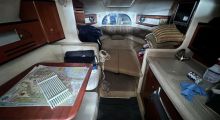 A centerline companionway leads to this 280’s cherry-trimmed interior with U-shaped dinette to port, full-service galley opposite, convertible V-berth forward (with removable table), and a compact head/shower with Vacuflush toilet to starboard. Privacy curtains separate both sleeping areas from the salon.