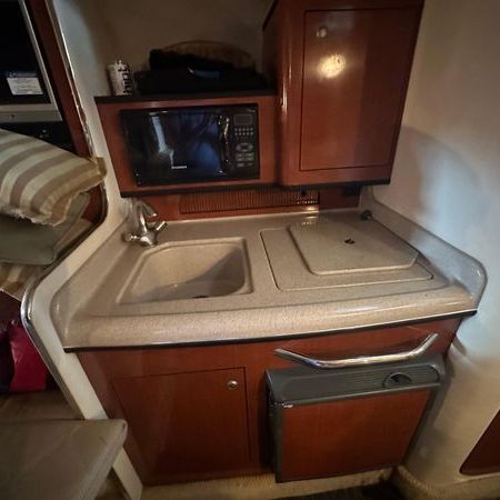 Sea Ray hit all the right buttons with the 280 Sundancer: attractive styling, top-shelf amenities, and a well-appointed interior with comfortable accommodations for six. Beginning with her spacious single-level cockpit with wet bar, portside lounger, and transom door, the stern bench seat folds out of the way when not needed and the rear-facing bench seat converts to a sun lounge.