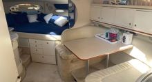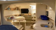 V-Berth Master Berth has offset queen w/ drawers, hanging locker, mirror and storage below Carpet Runners Clarion Stereo w/ Helm Remote Flatscreen TV Side Storage Lockers and Shelves Trash Receptacle Several opening Port Lights w/ Shade Large Bathroom w/ Sink, Vanity, Shower and VacuFlush Head Lower Cabin conversation area converts to double berth w/ slide out base and filler