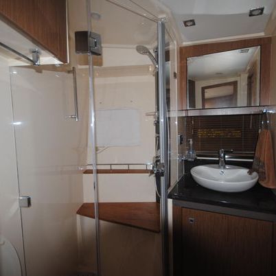 - Primary Stateroom Aft with Adjacent Ensuite Sink and Vanity, and Separate Head and Shower with Privacy Door.