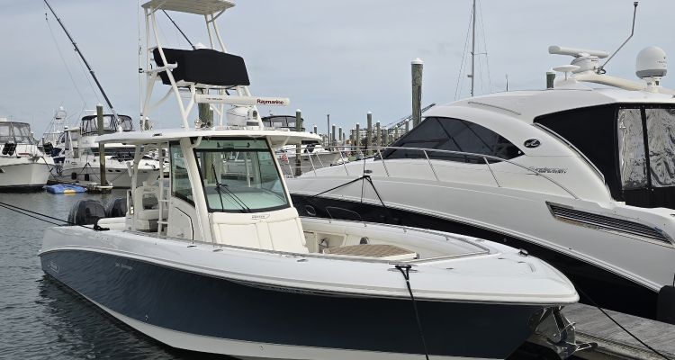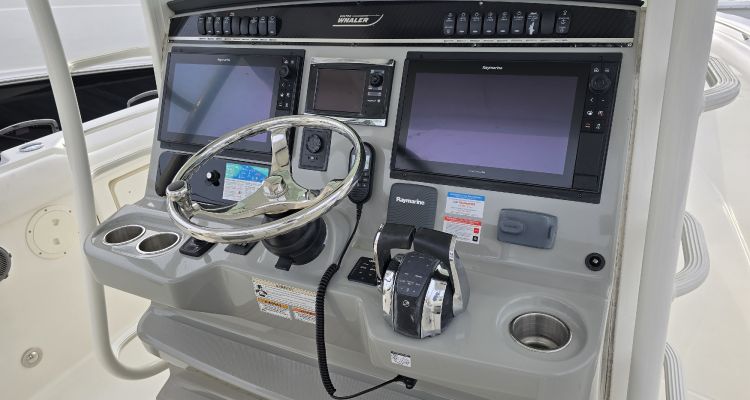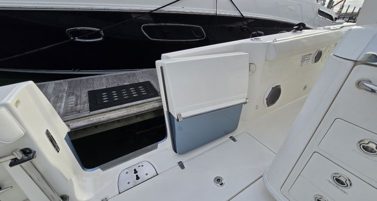 - Stainless steel drink holders – bow (2), hawse pipes (2), helm (3), leaning post (4), forward console lounge (2), bow seating area integrated into low bow rail (4)
