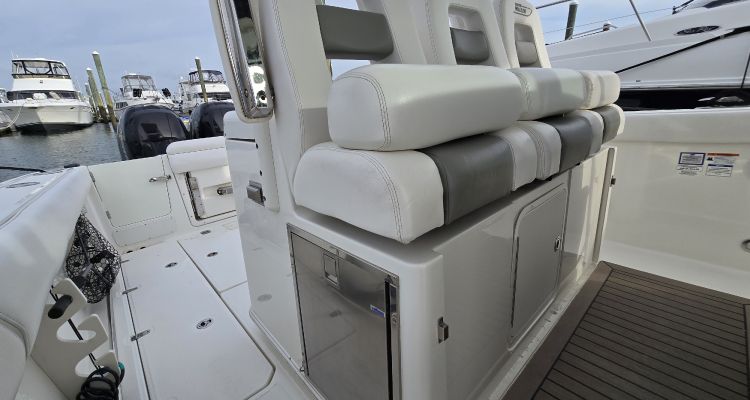 - Helm and companion bolster style seats (3) with fold-down armrests (2) (center seat is mechanically adjustable fore and aft)