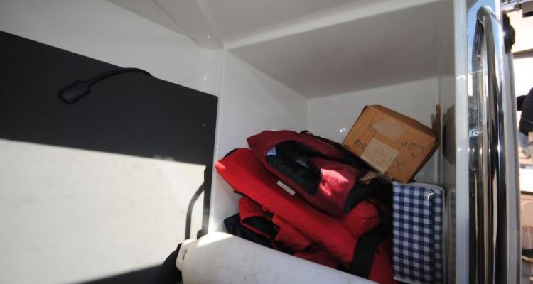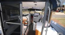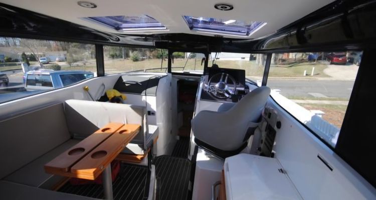 This well-kept XO 270 RS Cabin will certainly weather rough seas like there is no tomorrow. Powered by twin Evinrude E-Tec 250 hp outboards with only 75 hours! The hull is longitudinally framed internal strengtheners sheathed with exceptionally light, military-spec aluminum panels, and engineered to handle rough water. The starboard-side helm station features a fully adjustable, shock-absorbing helm seat. A sliding companionway hatch, forward of the windshield, lends access to the bow for setting an anchor or tending bow lines. As for accommodations, a couple of steps down the companionway resides a small, but entirely adequate, cabin space that accommodates two sleepers. There is a space-saving convertible dinette and galley tucked in the corner. Fully aft, just forward of the outboards, and behind the cabin we find a protected aft deck area with seating. Cabin seating shelter is plentiful, as well.