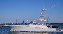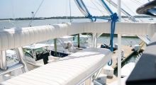 An open-styled sportfish with a full-sized cockpit (140 square feet). Tackle center forward has cockpit freezer, engine room entrance and instead of the rigging sink there is a Kenyon electric grill. Electric reel plugs beneath the coaming corners. Transom box is plumbed as a live well, plus there is a under deck circular livewell on the portside. A large under deck fishbox with 2 hatches and to the starboard side is an Eskimo crushed ice bin (or second fish box). Fiberglass rocket launcher with rigging tray on 4" stanchion. Beneath the gunwales there are stereo speakers & lighting. Hanging rod storage under hardtop & in ER.