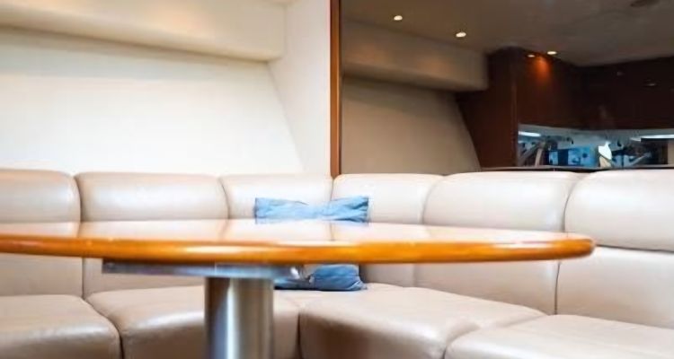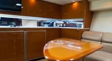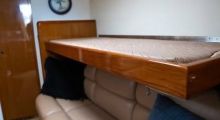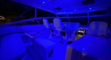 Entering the cockpit you notice the coaming pads and a transom box before passing the rocket launcher to go up three steps to the huge temperature-controlled bridge deck. To the portside aft is a large L-shape settee with triangular white fiberglass table in front. To the starboard side is another smaller bench seating area and just forward a prep center with rigging table, insulated drink box, and below a refrigerator with mini-freezer. Three white/chrome Stidd adjustable helm & companion chairs with footrests face the forward windshield. Track-to-track enclosure fills hardtop to windshield top offering excellent vision in all directions from every seat. U-zips open on the sides and aft panel combined with two overhead hatches in the hardtop if fresh breeze is the choice over the reverse-cycle air conditioning units. The hardtop has integral lighting and custom overhead hanging rod storage beneath. The helm has all electronics low and facing the captain with a fiberglass helm pod topped by a chrome bezelled analog instrument cluster, single lever controls and a aluminum custom wheel. Just to the right the smoked plexi and white metal framed door slides open to enter the cabin.