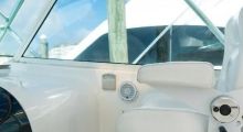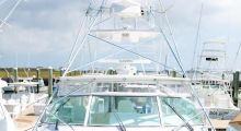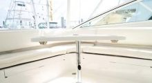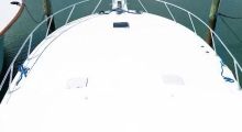 Factory pulpit with aluminum bow rail, stainless anchor chute, Fortress anchor, chain lead rode, and Simpson Lawrence electric, self-tailing, windlass with remote control from helm and foot switches. Wrap-around windshield has track-to-track NEW full enclosure (1/19) up to the hardtop and three windshield wipers. Hatch gaskets and gas-shock rams (stainless steel) throughout cockpit & helm deck replaced.