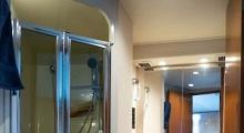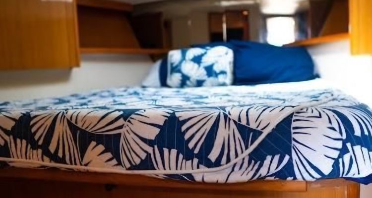 The master stateroom features a raised platform centerline queen berth with teak cabinetry to either side and a mirrored headboard forward. A blue & white tropical print bedspread is accented with shams and decor pillows. Port & starboard cedar-lined hanging locker & storage cabinet. There is also storage beneath the berth. There is a private door to the head which has a mirrored medicine cabinet, neutral colored solid surface vanity top with molded sink, and a good sized shower stall.